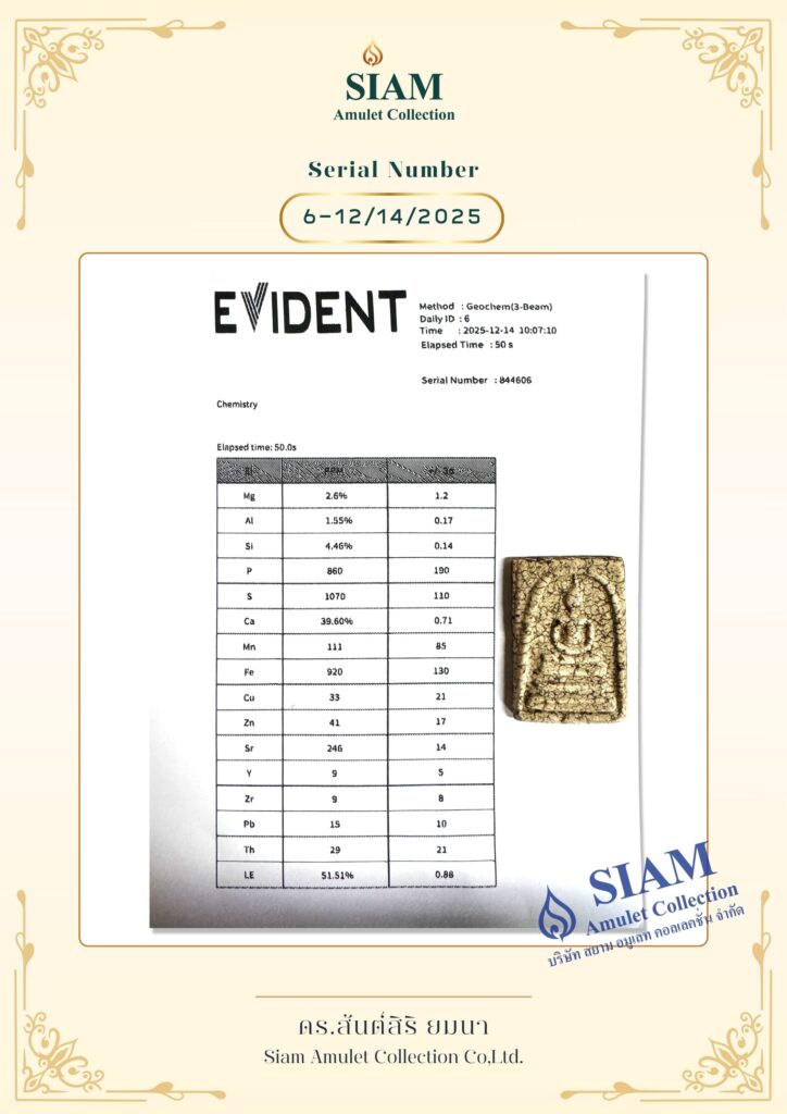 นำพระเครื่องที่ผ่านการประเมินเบื้องต้นมาวิเคราะห์ด้วยเครื่องเอกซเรย์ฟลูออเรสเซนต์ (XRF) เพื่อตรวจสอบองค์ประกอบทางเคมีของวัตถุ ยืนยันความแท้จริงในระดับโครงสร้างวัตถุ โดยใช้พลังงาน 8-50 kV เป็นเวลา 45 วินาที-5 นาที เพื่อระบุธาตุหลัก (เช่น Si, Ca, Fe) และธาตุรอง (เช่น Cu, Zn) ผลลัพธ์จะถูกเปรียบเทียบกับบันทึกการสร้างในยุคนั้น (เช่น ดินผสมว่าน หรือโลหะผสมโบราณ) หากสอดคล้องจึงผ่านเกณฑ์